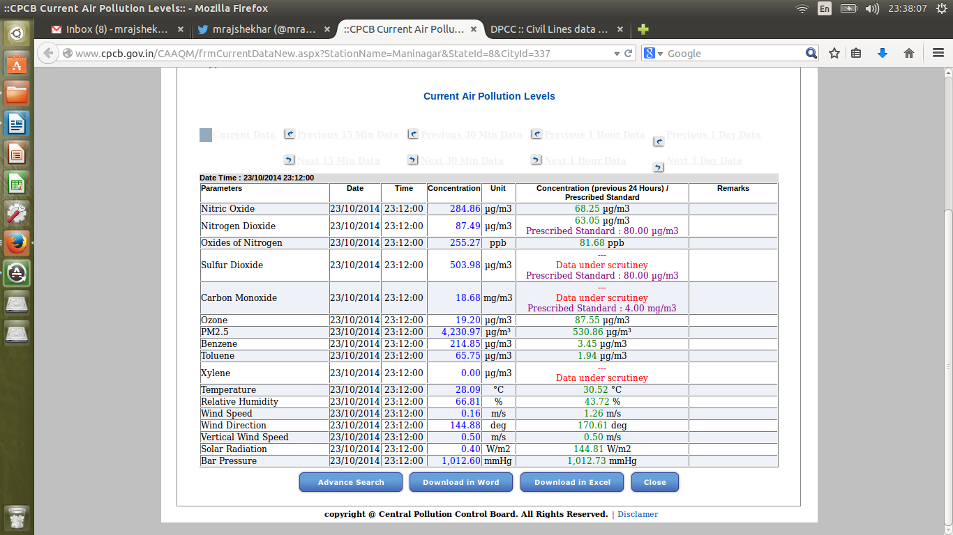 numbers from the civil lines air quality station, run by the delhi pollution control committee, as of 2215 hrs, yesterday. pm10 at 1000 (safety limit: 100). pm 2.5 at 995 (safety limit: 60). shortly afterwards, pm 2.5 climbed close to 1000 as well, reaching 999.85.look at this chart. the way pm10 levels max out at 1000 suggests that the sensor might be set up to capture levels only till 1000 micrograms/cu m (understandably, given the safe limit is 60). i wonder what was the real extent of particulate pollution yesterday.i have a fairly high degree of comfort with dpcc data. less so with the cpcb and spcbs. the cpcb, last night, was ridiculous. its sites were presenting allegedly realtime data for 2013 for parts of delhi. as for the spcbs, most of them were well below delhi. but one number from ahmedabad really made me sit up. look at pm2.5.