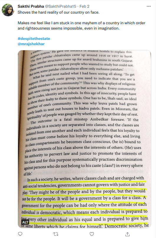 The book is much the same as before. Over the last year, it has received a lot of kind feedback and so, being opportunistic through and through, I have expanded endorsements in the second edition — we have now included Ben Rogaly, who taught me at the University of Sussex; Dan Taylor, whose deeply perceptive book on pre-Brexit Britain was cited in Despite the State; Indrajit Gupta, who taught me my journalism; veteran development reporter Latha Jishnu; former RBI governor Raghuram Rajan; and Suchitra Vijayan, who runs the fearless Polis Project. The book has also been reviewed by MoneyControl, Tribune, Malayala Manorama, QindeelOnline, Business Standard, Seminar, Open, The Hindu, Scroll.in, Biblio and Le Monde. Apart from these, the book also made it to top book lists (for 2021) in The Hindu, Himal Southasian and The Wire. We have bunged bits from most of these into the book’s opening pages as well.